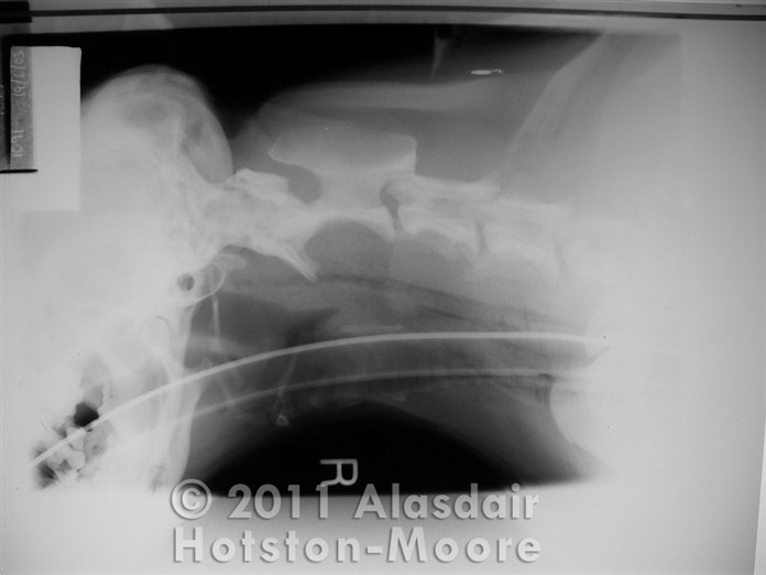 Lateral cervical radiograph of a dog after a suspected pharyngeal stick injury.