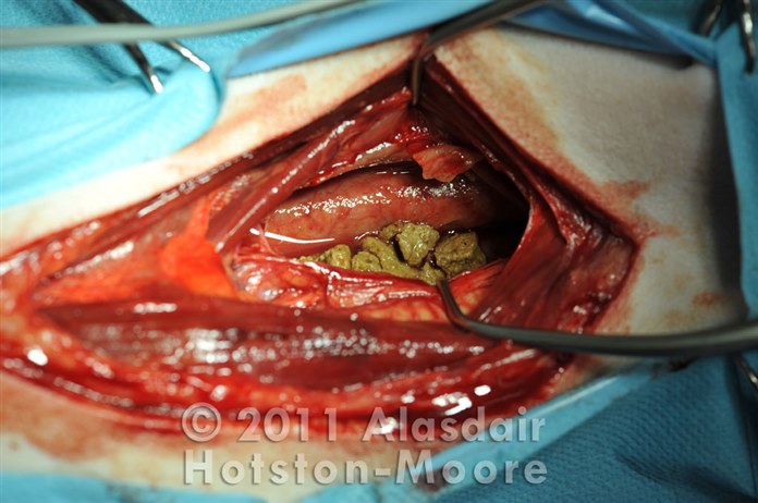 This dog has sustained a stick injury 48 hours previously. The dog has been shocked at first then improved but developed neck swelling and pyrexia. Neck Xrays show emphysema and an unusual pattern within the soft tissues, confirmed to be kibbles of dog food at exploration.
