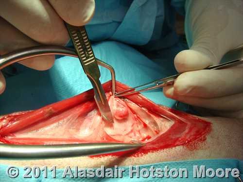 Parathyroid adenoma in a hypercalcaemic dog. The masses are typically 0.5-2cm in size, non-invasive and may be adjacent to, within or separate from the thyroid gland. This example is at the cranial pole of the thyroid.