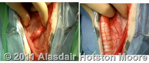 Small thyroid carcinoma on a dog (right image) and normal thyroid (left image). This is unusually small and relatively avascular and was discovered incidentally during an MRI to investigate neck pain.