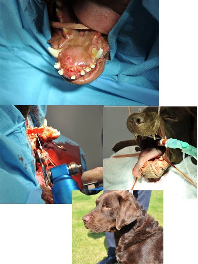 3 year old labrador with an ameloblastoma of the rostral mandible. A rostral bilateral manibulectomy was performed (middle row of images).
