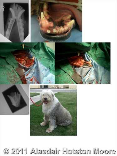 Old english sheepdog with acanthomatous epulis at base of right lower canine.